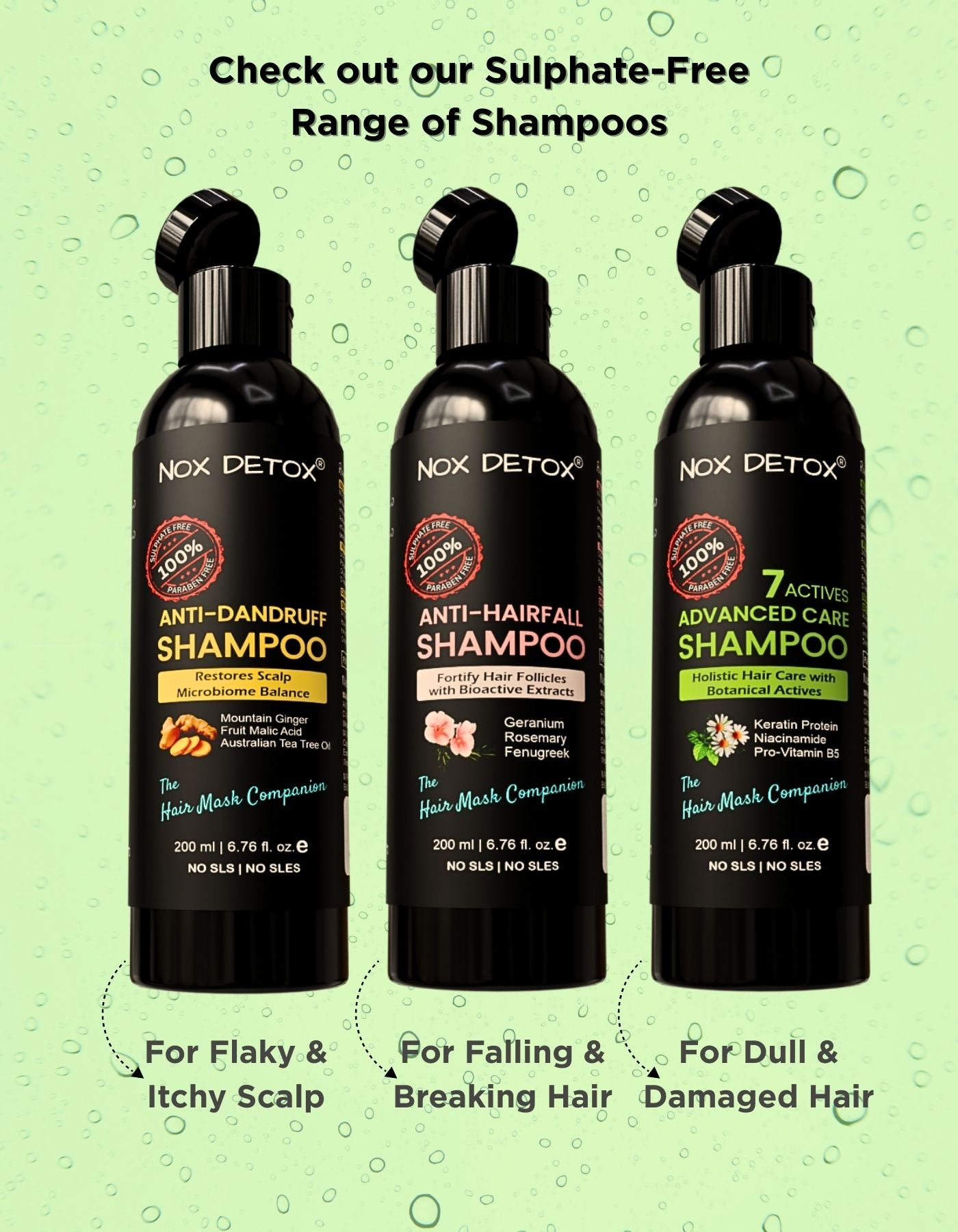 Patch test recommended before first use. Apply NOX DETOX 7 Actives Advanced Care Shampoo to wet hair, gently massage for 2-3 minutes,covering root to tip , then rinse thoroughly. Pat or wrap hair with a soft towel to dry. For best results, use NOX DETOX Hair Fall Control or Dandruff Control Night Hair Mask the previous night.